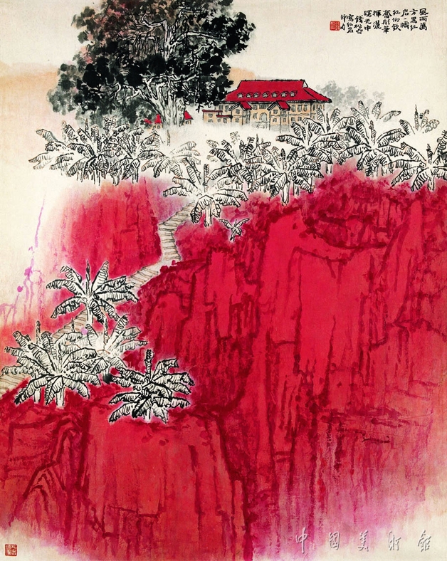 五六十年代,由于對藝術(shù)的教育功能的倡導(dǎo),山水畫也在革新的過程中出現(xiàn)了一批以革命紀(jì)念地為表現(xiàn)對象的作品,其中《紅巖》最具代表性。紅巖村為抗戰(zhàn)期間中共中央南方局及八路軍重慶辦事處駐址,1945年毛澤東赴重慶談判亦寓此。當(dāng)時(shí)年已花甲的錢松嵒滿懷激情,以“紅”為突破點(diǎn),大膽地將原址的黃土化為巖石,將泰山的漢柏造型“移植”紅巖紀(jì)念館旁,以白描手法畫芭蕉叢,避免了紅綠對比而使紅色得以純化。那“風(fēng)雨萬方黑,紅巖一幟紅。仰欽奮彤筆,揮灑曙光中”的五言題詩,正是畫家所寄情懷及意匠經(jīng)營的高度概括。