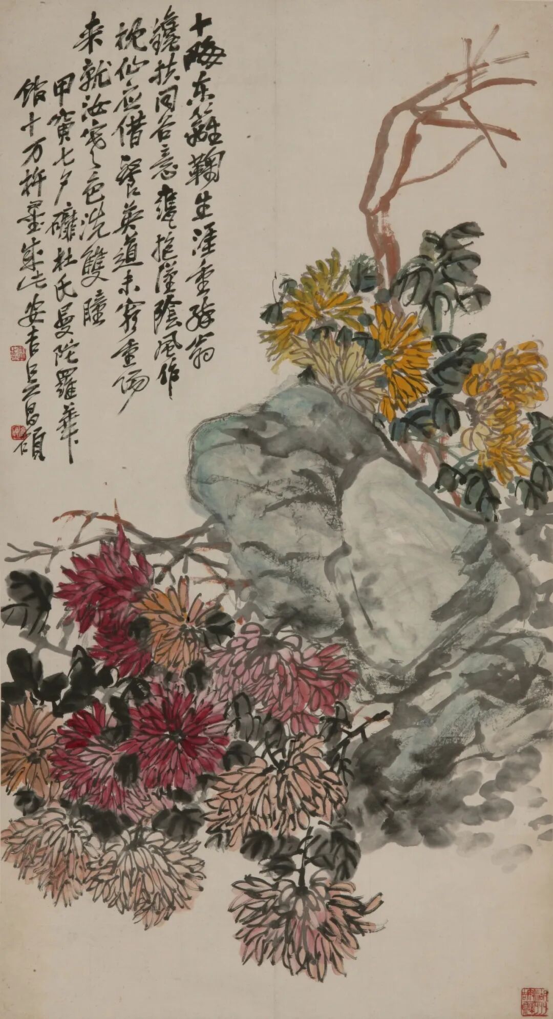 此幅《菊花圖》作于甲寅年(1914年),時年七十一歲的吳昌碩已步入藝術巔峰。畫面以對角斜勢構圖,數(shù)叢菊花自右下向左上舒展,枝干虬曲如篆籀筆法寫就,蒼勁有力,墨色濃淡相生,盡顯金石之氣。花葉俯仰向背,疏密有致,形成“疏可走馬,密不透風”的節(jié)奏感。設色濃麗而不俗,紅、黃、粉、赭交相輝映,卻以墨線勾勒主干、濃墨點葉壓陣,實現(xiàn)“色不掩墨、墨不壓色”的視覺平衡,艷中見拙,重中有清。