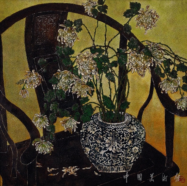 這幅靜物花卉漆畫基本以對象的本色來體現(xiàn)色彩效果。黑色的明式圈椅作為構(gòu)成骨架,青花瓷罐和罐中的白菊為主體形象,與泥銀彩繪的背景組成了這黑、白、灰的世界。作者追求漆畫語言的凝練單純,追摹宋畫的雍容端莊,同時注重現(xiàn)代形式美感與漆性的表現(xiàn),試圖在古典神韻與現(xiàn)代精神之間找到藝術(shù)的契合點(diǎn)。
