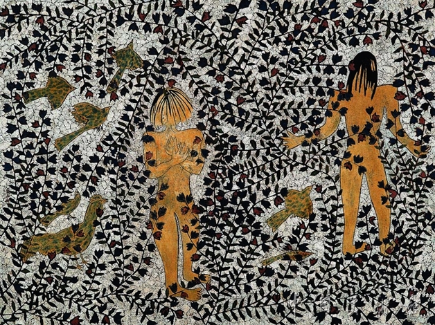 漆畫曾一度存在著模仿油畫或版畫的寫實(shí)傾向,而這并非漆畫所長(zhǎng)。90年代前后,許多漆畫家卸下了再現(xiàn)的重負(fù),走向裝飾和漆畫自身。詩(shī)意的情調(diào)與形式的美感在他們的畫中得到輕松展示,藍(lán)麗娜的《三角梅開(kāi)了》即為一例。此畫表達(dá)了春的萌動(dòng)、自然的召喚,以及人們對(duì)美好生活的渴望。此畫材料以天然大漆為主,間以色粉、銀粉,背景以蛋殼鑲嵌而成,蛋殼破損后所形成的肌理表現(xiàn)出特有的材質(zhì)美。滿密的枝條縱橫交錯(cuò),三角梅怒放在枝頭,兩個(gè)女孩和幾只小鳥(niǎo)徜徉在樹(shù)叢中,就像是在春的懷里。 藍(lán)麗娜,女,畬族,1958年生于福建南靖縣。1988年人中央民族學(xué)院美術(shù)系,現(xiàn)為北京職業(yè)畫家。