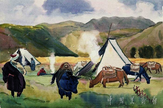 韓樂然可能是最早加入中國共產(chǎn)黨的美術(shù)家。而他的油畫和水彩畫卻不同于革命美術(shù)的通常表現(xiàn),而類如得道的風情畫家。1945年,他到青海塔爾寺和甘肅拉布楞寺進行旅行寫生,《草原上的生活》既是這一時期他大量水彩寫生中的一幅。在這件清新明快的作品中,畫家發(fā)揮了水彩畫的特色,用動情的飽含水分的畫筆,澄碧透明的色彩,單純概括的造型,勾畫出高原上藏民們牧歌式的生活。起伏有致的青山和藍天映襯下的草原上的幾縷炊煙,在輕松恬靜的氣氛中充滿了詩意。他原本就是這樣一位熱愛生活、熱愛祖國的人。
