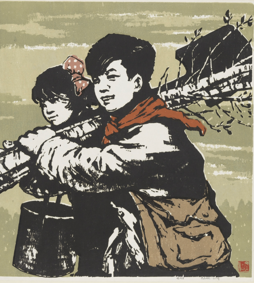 版畫作品《植樹去》,以“植樹”為敘述中心,表現(xiàn)了少年結隊去植樹的情節(jié)。作品選取了兩位并排行進的少年進行具體刻畫。其中,男孩領間系著紅領巾,斜挎棕色書包,扛著成捆的樹苗;一側的女孩留著齊耳短發(fā),扎著橘色發(fā)結,肩頭扛著鐵鍬,臂彎挎著水桶。畫面上,兩位少年嘴角上揚,洋溢著發(fā)自心底的微笑,紅領巾迎風飄動,眼中滿是希望。少年身后是大片的黃綠色背景,它一方面暗示了事件發(fā)生時間為早春時節(jié)、發(fā)生地點為河川谷地,另一方面指代還有千百位同學少年行進在去植樹的路上。這是傳統(tǒng)中國畫留白藝術手法在版畫創(chuàng)作實踐中的創(chuàng)造性運用,收到以少勝多、不似之似、虛實相生的藝術效果。
