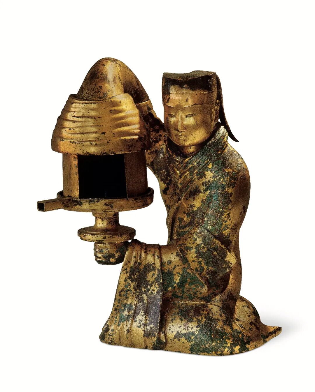 長(zhǎng)信宮燈是西漢時(shí)期的一件青銅鎏金燈具,大約制成于公元前151年。它于1968年在中山靖王劉勝之妻竇綰墓出土,因燈身刻有“長(zhǎng)信”的銘文而得名。燈的造型為宮女跪坐狀,體內(nèi)中空,通體鎏金,分六部分鑄造:頭部、右臂、身軀、燈罩、燈盤(pán)、燈座,可拼接拆卸,方便挪動(dòng)和清洗。設(shè)計(jì)方面,暗藏環(huán)保巧思,宮女右臂為煙道,可吸納煙塵,且燈罩可調(diào)、燈盤(pán)可轉(zhuǎn)。造型方面,宮女頭梳髻,發(fā)上覆巾幗,內(nèi)穿廣袖,外著長(zhǎng)袍,衣紋流暢自然,姿態(tài)恭謹(jǐn)溫婉。可見(jiàn),長(zhǎng)信宮燈集實(shí)用性、科學(xué)性和藝術(shù)性于一體,充分體現(xiàn)了古人的智慧,被譽(yù)為“中華第一燈”。