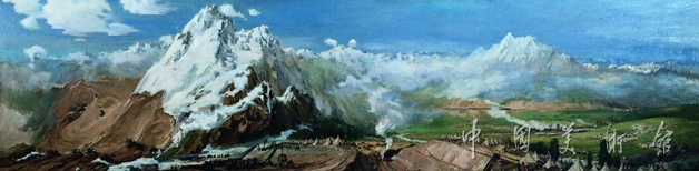 作為徐悲鴻的學(xué)生,他在教學(xué)上曾協(xié)助徐悲鴻做了大量工作。他首先提出了按油畫風(fēng)格劃分工作室的教學(xué)方案,并參與主持第一油畫工作室的教學(xué)工作。1954年春,他到烏鞘嶺蘭新鐵路工程隊體驗生活,有感于五月大雪之后祁連山脈的奇?zhèn)バ劬吞m新鐵路建設(shè)工地上熱火朝天的勞動場面,創(chuàng)作了這件氣勢恢宏的油畫風(fēng)景畫。畫家以平遠(yuǎn)的視線,寬銀幕式的寬廣構(gòu)圖,純正亮麗的色彩,細(xì)而不膩的筆法,描繪了壯麗的山川自然景色。通過對勞動工地上人聲鼎沸,推土機轟鳴的熱火朝天的勞動場面的描繪,表現(xiàn)出當(dāng)時大自然的巨大變化而具有鮮明的時代感。畫家以冷色調(diào)的藍(lán)天、白云、雪山、草原烘托出暖色調(diào)的黃土裸露的建設(shè)工地和工地旁連營扎寨的帳篷,并由此揭示了人與自然的矛盾,歌頌了人的力量的必勝,而這正是當(dāng)時的主導(dǎo)思想?!都t軍過雪山》是艾中信五十年代的又一件重要作品。《夜渡黃河》為六十年代的代表作。多年來,在堅持油畫教學(xué)和創(chuàng)作的同時,艾中信始終堅持油畫史論的研究,發(fā)表了許多論文,其中《油畫風(fēng)采談》影響很大。