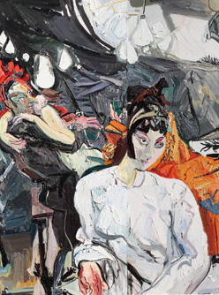 閆平的繪畫是具有生命力的感性與理性的結(jié)合?!堕W爍如歌》是閆平最新的一幅力作。近幾年,閆平以“小戲班”系列為題材創(chuàng)作了一批作品。題材的選擇源于藝術(shù)家早年接觸過的人群。她說,“小戲班的戲曲演員居無定所,到處流動,過著類似于群居的生活,但是一上臺,仿佛變成另外一個人。我希望畫面表現(xiàn)他們‘艷麗’的外表時,也流露出來哀愁的情感思緒。因為現(xiàn)實生活的具體和瑣碎更加反襯出藝術(shù)的‘超現(xiàn)實’?!?《閃爍如歌》描繪了一個戲班的后臺,化妝、排練、休閑,這里就是小戲班的全部生活。坐于畫面前方的女藝人是畫面的主角,她身著一襲白衣襯服,悠閑地姿態(tài)和表情顯示出她內(nèi)心的放松與平靜。雖然生活不易,但是每個人都在盡心做好自己的事情,這就是屬于她自己的內(nèi)心世界。閆平說,“最閃爍之光,不是天上的太陽,而是在我的心里。在我若大無比的藝術(shù)世界里?!?畫出屬于她自己的真實,筆底奔放的基調(diào)和秾麗的色調(diào),都源于其發(fā)現(xiàn)生活與藝術(shù)之間奇妙的契合點。閆平透過這位白衣女子,觀察著小戲班的生活,揣測著這位女子的內(nèi)心思緒;與此同時,也借助女子目光中閃現(xiàn)的堅定,流露出個人內(nèi)心世界的感悟,是為其探尋自由、獨立和有感而發(fā)的心性表達(dá)。