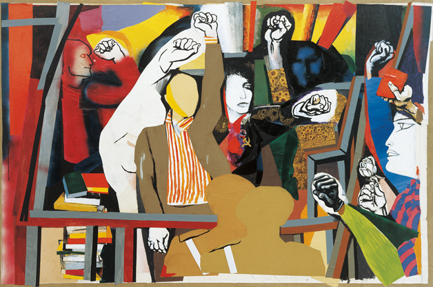 雷那多·古圖索,1911年生于巴蓋里亞;1940年加入共產(chǎn)黨;1943年至1945年為游擊隊(duì)員;1961年任羅馬美術(shù)學(xué)院教授;1987年在瓦雷澤附近的維拉特去世。這是一幅大型拼貼畫(huà),由紙屑、張貼畫(huà)、畫(huà)刊剪報(bào)、五顏六色的膠條、塑料條、色彩涂塊拼貼而成。古圖索用這些原料繪制成一個(gè)學(xué)生法庭。被告席上站著一群人,他們高舉手臂、緊握拳頭,其中正中間的那個(gè)人上衣上別著象征共產(chǎn)主義的鐮刀錘頭徽章。這群人臉上寫(xiě)滿(mǎn)必勝的信心,并贏得了站在畫(huà)面右側(cè)的聽(tīng)眾的贊許與支持。這些聽(tīng)眾用拳頭、紅色的黨章和玫瑰花來(lái)表現(xiàn)愛(ài)和勇氣。畫(huà)面的左側(cè)有一堆書(shū),暗示被告是有豐富知識(shí)的學(xué)生。被告席由木欄桿圍著,將這群人同另外兩個(gè)只刻畫(huà)簡(jiǎn)單輪廓的人分開(kāi)。從衣服的顏色以及他們左肩上的白色膠條可以隱約分辨出這是兩名士兵。作者賦予學(xué)生們富于表現(xiàn)力的鮮明色彩,與此相反,兩名士兵則顯得黯然失色,毫不起眼。古圖索所描繪的審判,發(fā)生在米蘭。這幅作品與他關(guān)于巴黎學(xué)生起義的畫(huà)作《六八年五月墻報(bào)》天然成對(duì)。作為批判現(xiàn)實(shí)主義的代表,古圖索至死都是一個(gè)政治戰(zhàn)士。他用盡二十世紀(jì)所有的繪畫(huà)手法及風(fēng)格來(lái)控訴法西斯主義,并積極靠攏意大利共產(chǎn)黨。受畢加索的影響,他于一九四五年創(chuàng)立了一種融表現(xiàn)主義、立體派和西西里民間藝術(shù)為一體的新表現(xiàn)主義的戲劇表現(xiàn)手法。上世紀(jì)六十年代,他把波普藝術(shù)的語(yǔ)言表現(xiàn)手法運(yùn)用到他的作品中。