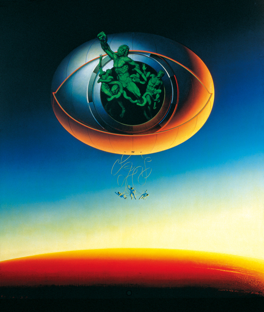 魯?shù)婪颉ず浪辜{,1914年生于維也納;1931年至1936年,就讀于維也納美術學院;1968年在維也納美術學院任教;1995年去世?,F(xiàn)存放于羅馬梵蒂岡博物館中的大理石群像《拉奧孔》是希臘藝術后期的卓越典范。它原本出現(xiàn)在臺比留皇帝時代(公元四年至三十七年間),是已被丟失的,古希臘時期青銅原作的復制品。它的發(fā)現(xiàn)對古希臘羅馬珍品的復制和研究起到了重要作用。它描寫了一個古希臘神話故事——特洛伊的牧師拉奧孔和他的兒子的悲劇。這個悲劇故事記載于荷馬史詩《伊利亞特》中。在對特洛伊城進行了長達十年的徒勞圍困之后,奧德修斯獻出木馬計使希臘人獲勝。他們佯裝撤退,并在海灘上放置了一個巨型的木馬作為對雅典女神的祭品,而木馬的腹內(nèi)則埋藏著一批精兵。拉奧孔預料到了希臘人的計謀,并警告他的國人。所以,雅典娜女神派巨蛇纏住拉奧孔和他的兒子并用毒牙咬死了他們。特洛伊人認為拉奧孔的死是神的旨意,是對狂妄的牧師的懲罰,并把木馬運到城里。夜里,藏在木馬腹內(nèi)的希臘士兵從木馬里出來,為他們的戰(zhàn)友打開城門,從而打敗了特洛伊人?!独瓓W孔》群像以戲劇性的方式向人們展示了拉奧孔及其兒子與巨蛇搏斗的場面。牧師的形體表明了一個無罪的,但又因為神靈的專橫而陷入災難的人的范例。豪斯納在他的這件作品里以近似拍攝式的準確,詳盡地描繪了《拉奧孔》群像。他把原作中白色大理石的雕塑融入到綠色的光線中,并把他們置于地球的軌道之中。在豪斯納的繪畫中,雕塑出現(xiàn)在位于多種色彩組成的不現(xiàn)實的空間中的宇宙飛船的圓口中。畫面上部的陰暗黑色浮現(xiàn)在逐漸變得明亮的藍色之上,畫面下部顯示了在暖黃色和橘黃色的色調(diào)中彎曲的地平線。宇宙飛船下面三個宇航員漂浮在空中,他們的姿態(tài)與雕塑《拉奧孔》中的人物姿態(tài)類似。宇宙飛船的圓口使人聯(lián)想到一只碩大的眼睛,而這只“眼睛”以其原始神學的象征手法表現(xiàn)了上帝的知識器官和無所不知。但這是一臺沒有靈魂的機器,其冰冷的目光引起人們對機器人、攝像機和喬治·奧爾維爾的未來小說《1984》的聯(lián)想。《1984》這部小說描繪出一幅以個人的完美無缺的監(jiān)督為目的的極權主義世界國家的草圖。藝術家把所有的技術現(xiàn)象看作我們時代的“特洛伊木馬”,也就是看作是當代的我們必須意識到的危險。豪斯納在其非凡的畫作中闡明了一個古老神話的新解釋。他把拉奧孔的原始作用作為告誡,置于我們社會對技術幻想與現(xiàn)代生活前后關聯(lián)的氛圍中。阿波羅牧師的形體具有符合豪斯納的觀點的示范特點,他代表戒備和勇敢。豪斯納說:“拉奧孔意味著警告,同時也意味著技術要賦予人性的要求。我為我們大家舉薦的是更多的拉奧孔意識?!?豪斯納精確繪制的畫面是在長期的工作過程中形成的。作品中丙烯酸顏料在許多層的薄層中彼此疊加,致使出現(xiàn)一個光滑的,如琺瑯一般認不出筆跡的表面。豪斯納是維也納幻想現(xiàn)實主義流派的代表人物之一。這一流派形成于上世紀五十年代末期,并且吸收了超現(xiàn)實主義和象征主義繪畫的因素。