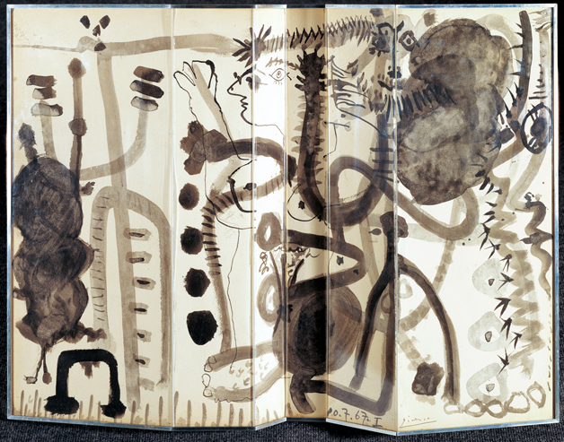 巴勃羅·畢加索,1881年生于馬拉加;1892年進(jìn)入拉·科魯納藝術(shù)學(xué)校繪畫班;1897年就讀于馬德里圣費爾南多皇家藝術(shù)學(xué)院;1973年在法國戛納附近的慕金斯去世。這件作品是一幅五折的圖畫,藝術(shù)家將其垂直豎起呈屏風(fēng)狀。筆法是畢加索作品的獨特之處。畫的左邊是兩個形似低音提琴的發(fā)聲體。畫面中間出現(xiàn)一個女人裸體,她的多角度透視表現(xiàn)手法使人想到畢加索立體主義時期的作品。她被彎彎曲曲的寬線條纏繞著,這些線條如同觸須般伸展在畫面上。她的右邊有一個由線條組成的、頭部類似動物的物象,一個長長的直拖到地面的陰莖突出了它的性別。繪畫的成分在整個畫面上結(jié)合成一個生機勃勃的畫的空間。除了多角度透視的女性形象外,由于折痕和皺紋,在畫面外形成了碎片狀。這意味著不僅在畫面上而且在畫作的空間展示上立體成分都考慮進(jìn)去了。畢加索的黑白色調(diào)的直立畫使人想起亞洲的皮影戲舞臺,而部分變形的形象使人感到與二十世紀(jì)六十年代A.R.彭克的世界系列畫相類似。正如畢加索的大部分作品一樣,這里的裸體女性處在突出的地位。中間的女性人物形象幾乎求助似的舉起手臂轉(zhuǎn)向左邊。一個女性的隱喻發(fā)聲體和裸體構(gòu)成一個空間和象征的統(tǒng)一體。右邊明顯的不安靜,這種混亂好像是由雄性怪獸發(fā)起的,怪獸正想完全占有女性的身體。兩性之間的斗爭是一個永恒的主題,它就像一根紅線貫穿在本世紀(jì)天才的作品中,轉(zhuǎn)換為三維形式,給作品賦予幾乎是客觀特性并且是藝術(shù)家技藝多樣性的另一個例證。同其他大多數(shù)作品一樣,這件作品注明有準(zhǔn)確的創(chuàng)作日期,這是畢加索努力留給后世的盡可能準(zhǔn)確的文獻(xiàn)。他說“您猜我為什么把我做的一切都注明日期?因為光認(rèn)識藝術(shù)家的作品還不夠,人們還必須知道他是在何時,為何,于何種條件下創(chuàng)作的?!?/p>